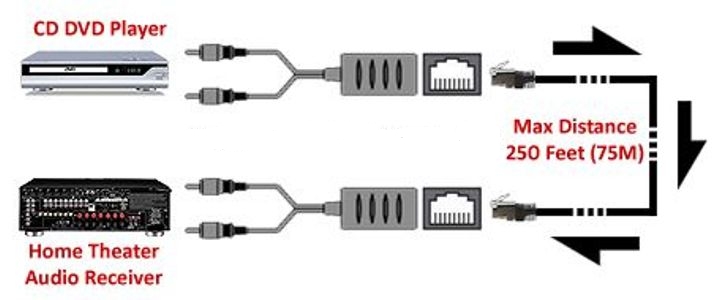 C помощью UTP кабеля категорий - "Cat5" "Cat5E" "Cat6" вы сможете передать звук до 75 метров! Простая установка, режим стерео/моно.